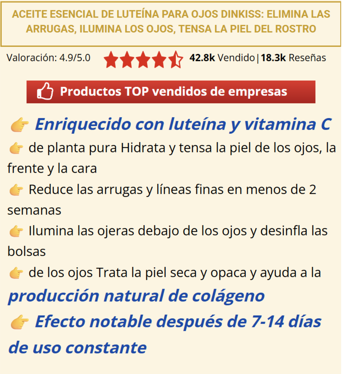 "Afortunadamente, un amigo me recomendó el aceite esencial para ojos de luteína Dinkiss. Lo uso dos veces al día, y después de casi un mes, la piel alrededor de los ojos y la frente se vuelve más suave, las arrugas son menores. ¡Es como volver a los años 30!"