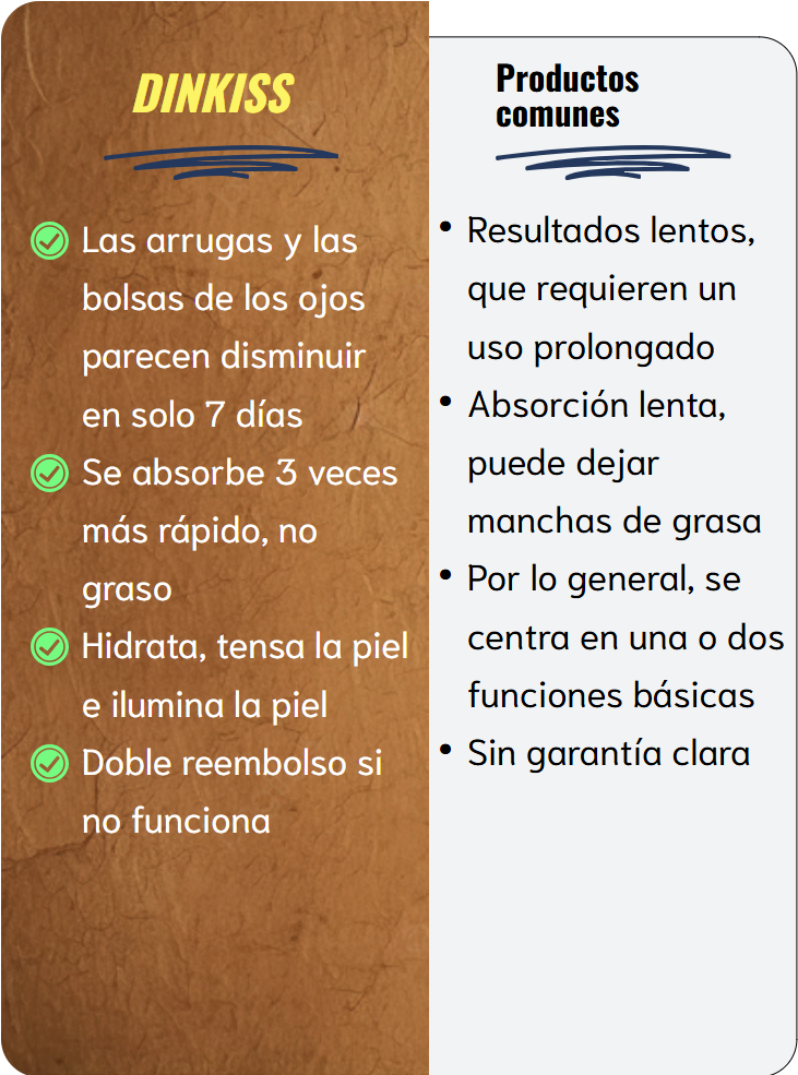 "Compartió que después de 3 semanas de usar Dinkiss, sintió que la piel debajo de sus ojos se volvió más suave y las ojeras se desvanecieron significativamente. La cara se ve más fresca y menos cansada".